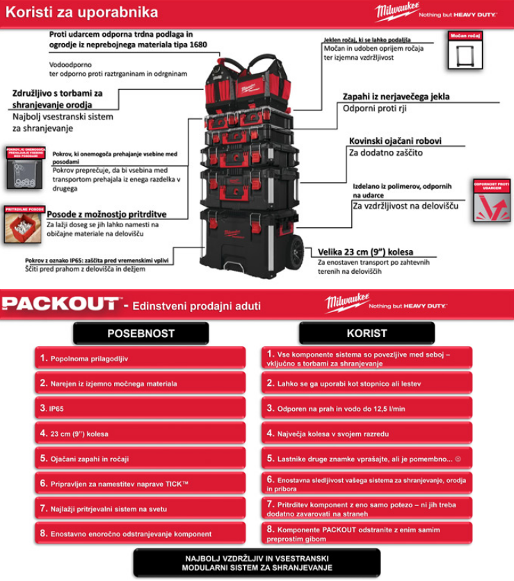 Kovčki in torbe za orodje PACKOUT je poseben modularni sistem za shranjevanje, transport in organiziranje električnega orodja in pribora. Uporabnikom omogoča samostojno kombiniranje in spajanje elementov iz široke ponudbe kovčkov za orodje, organizatorjev in torb za shranjevanje orodja. Vsak kovček za orodje modularnega sistema, uporabnikom omogoča, da sami ustvarjajo številne različne postavitve, ki so popolnoma prilagojene njihovim potrebam shranjevanja in transporta orodja v kovčkih in torbah.