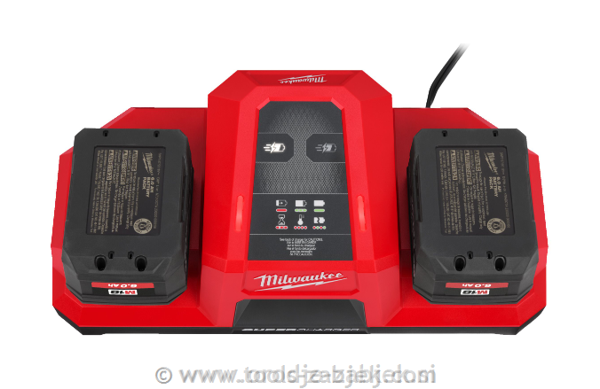 - super polnilnik Milwaukee M18 DBSC z dvema polnilnima mestoma zagotavlja do 6-krat hitrejše polnjenje do 80 % ter tako poveča produktivnost
