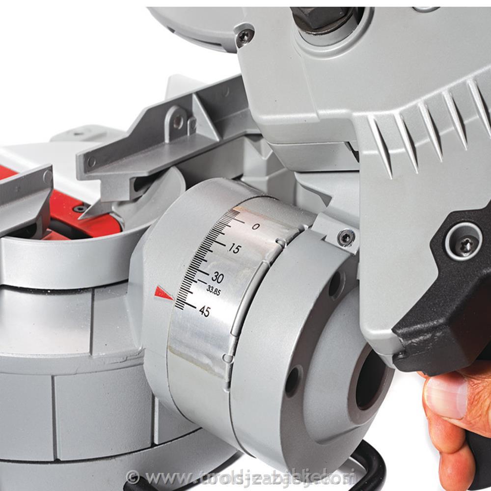 - Ročica z zaklepom v prednastavljenih kotnih utorih omogoča uporabniku enostavno in natančno ponavljanje rezov.