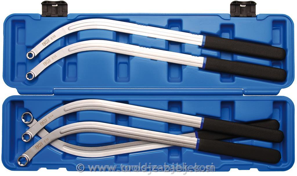 Product description Opis: - E10 - E12 - E14 - E16 - E18, dolžina 460 mm vsaka - 45 ° odmik pogonske glave vam omogoča, da dosežete vsa področja v predelu motorja - prostorsko varčen, ravno oblikovan - idealen za vijake jermena in napenjalnega jermenice - z ročajem za zaščito pred zdrsom za enostavno rokovanje