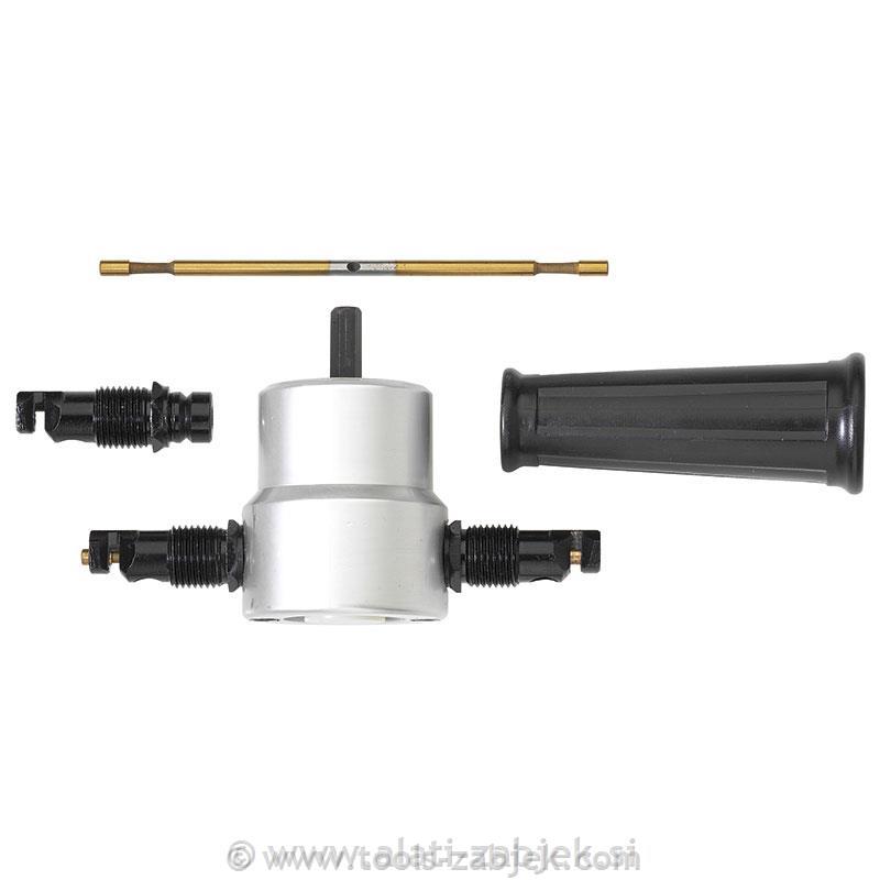 Škarje za pločevino za uporabo z električno ali baterijsko vrtalko, dvojna glava za ravne ali krožne reze.