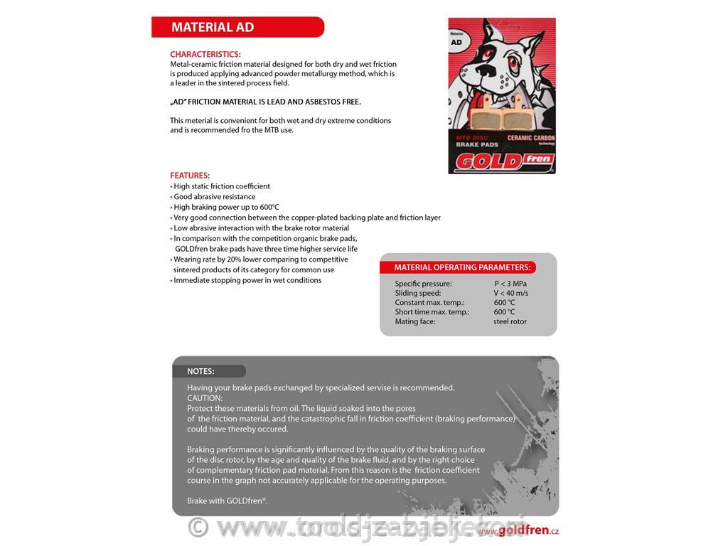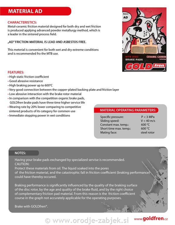 Product description Sintrane ploščice iz kovinsko-keramične zmesi, z odličnimi zavornimi lastnostmi tako v suhem kot mokrem. Zmes AD ne vsebuje sinca in azbesta. Odlikujejo jih: - visok statični koficient trenja - visoka odpornost na obrabo - velika zavorna moč do temp. 600°C - obstoja vez med zavorno ploščico in zavorno zmesjo - majhna obraba rotorja - trikrat manjša obraba ploščic v primerjavi z organskimi - do 20% manjša obraba v primerjavi za konkurenčnimi sintranimi ploščicami - vrhunska zavorna moč v suhem in mokrem Tehnične lastnosti zmesi: - Specifični tlak: P < 3 MPa - Hitrost drsenja: V < 40m/s - Max. konstantna temp.: 600°C - Max. kratkotrajna temp.: 600°C