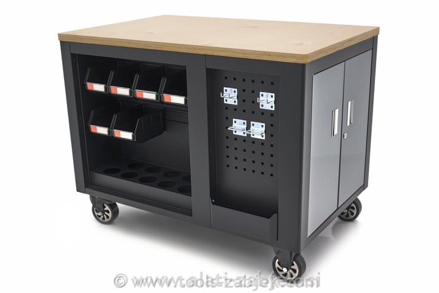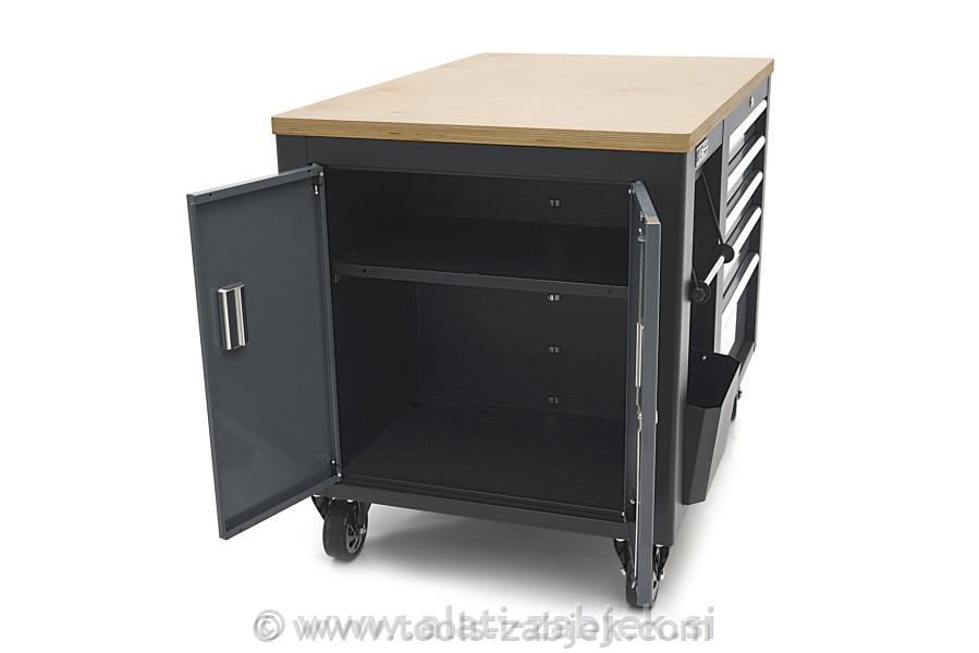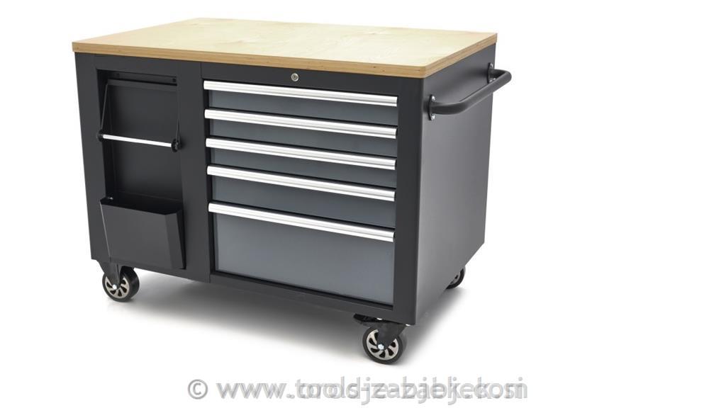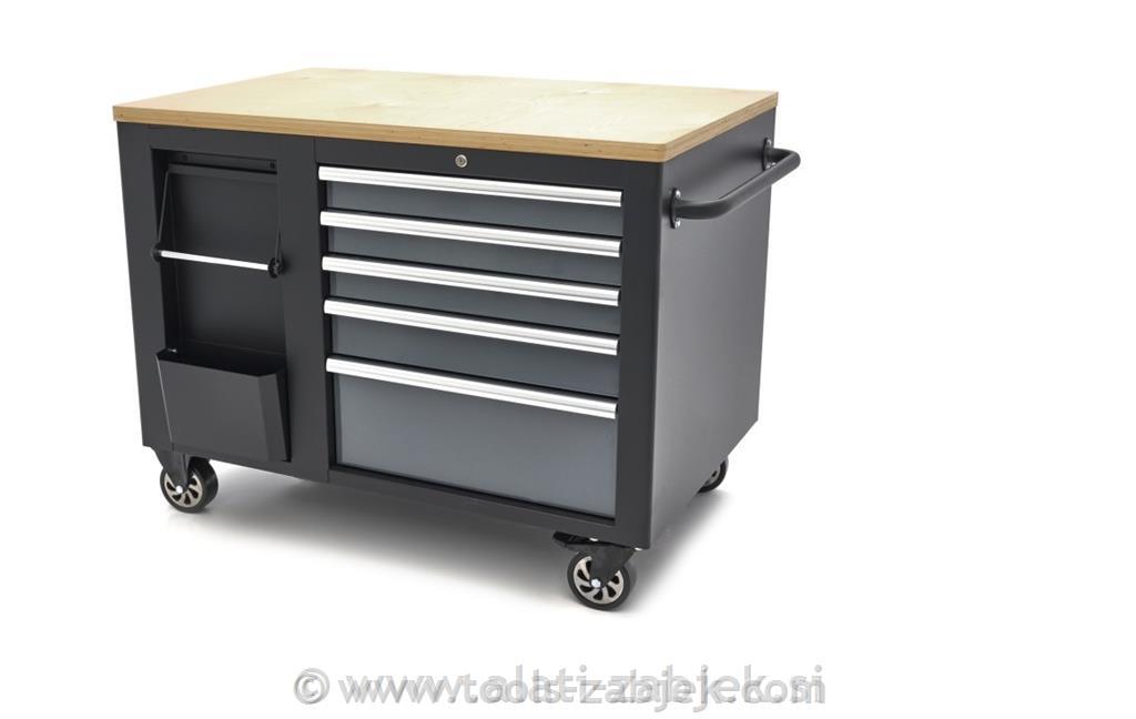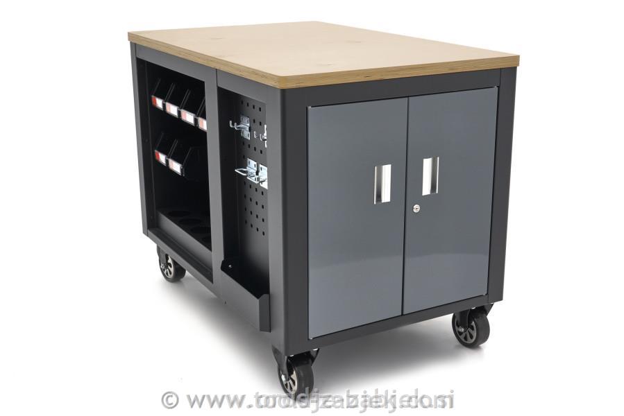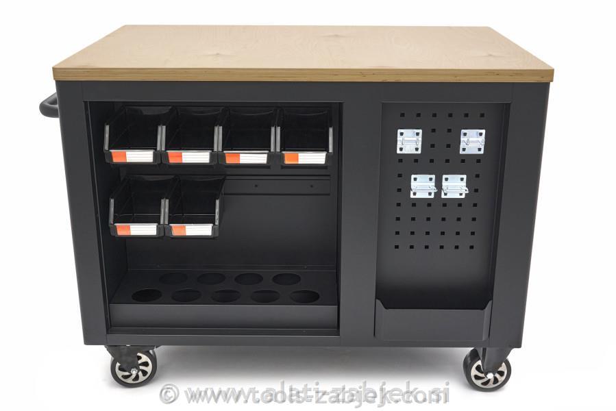 Mobilni voziček za orodje in delovna miza je visokokakovosten izdelek, ki je zasnovan tako, da nudi možnosti shranjevanja in dela. Ima robustno leseno delovno ploščo, ki je kot nalašč za različna dela in ponuja veliko prostora za organizacijo vašega orodja in materialov.