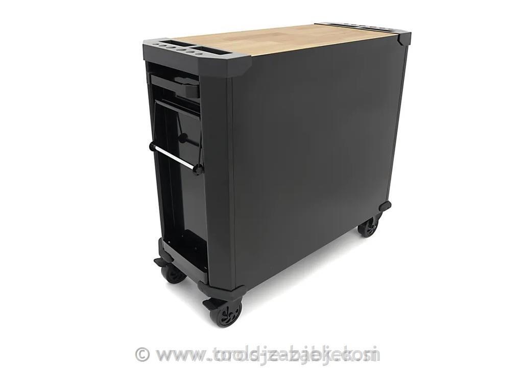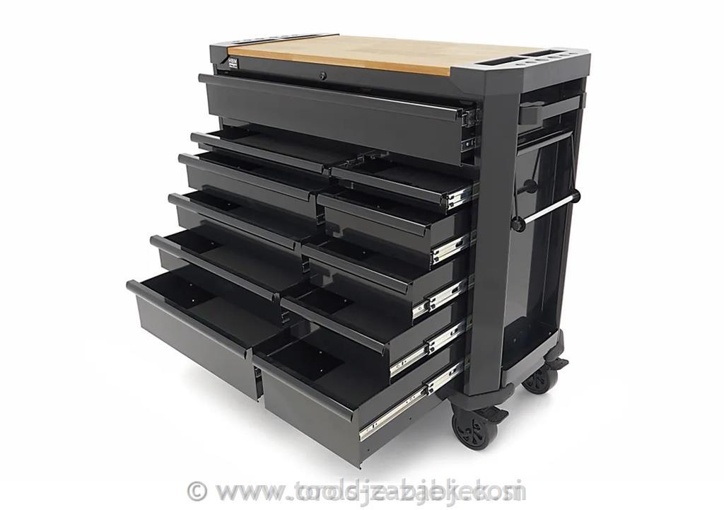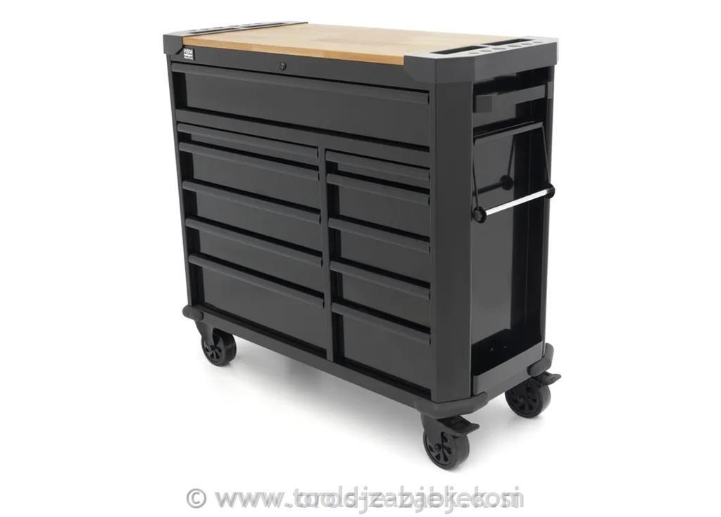 Voziček za orodje z 11 predali 109 cm črne barve je idealna rešitev za učinkovito organizacijo orodja in pripomočkov v delavnici ali garaži. Z 11 prostornimi predali ta voziček ponuja veliko prostora za shranjevanje, tako da lahko vse svoje orodje enostavno in lepo shranite na dosegu roke. 2 vrtljivi kolesi z zavorami in 2 fiksni kolesi zagotavljajo odlično mobilnost in stabilnost.