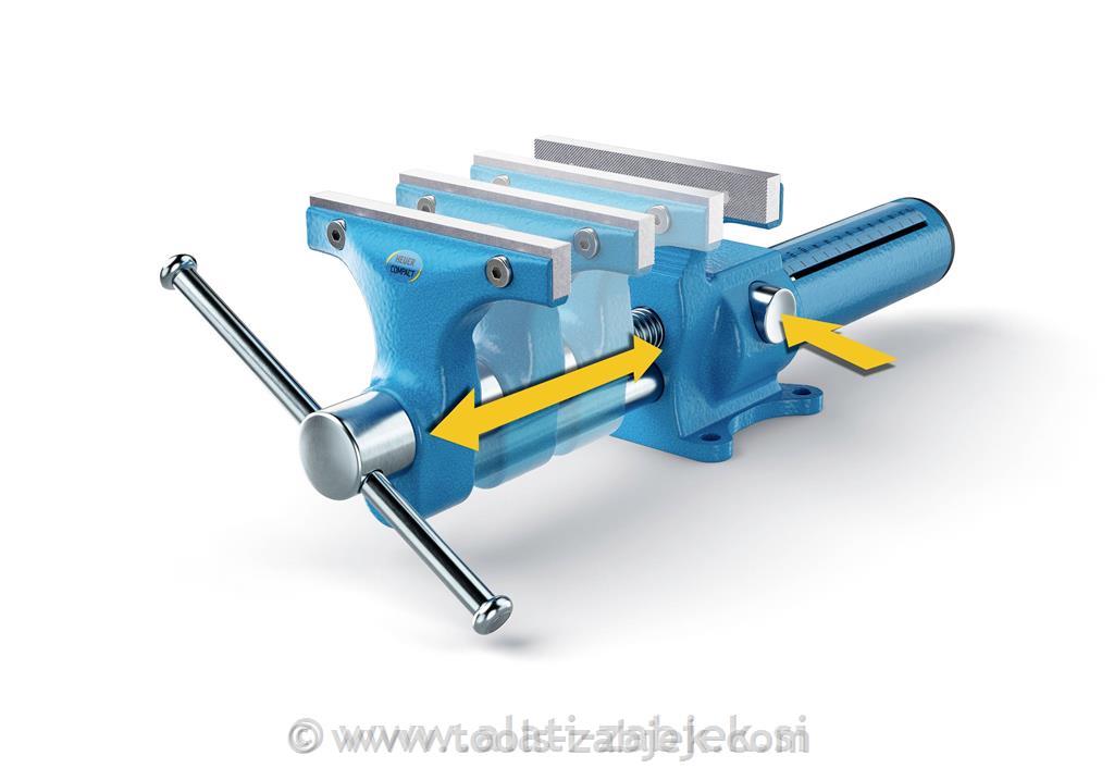 Zamenljive, vrtljive čeljusti z gladko in žlebasto vpenjalno površino ustvarjajo še večjo prilagodljivost. HEUER Compact je dodatno opremljen s čeljustmi za prijemanje cevi, integriranimi v sprednjo in zadnjo čeljust. Lahko se tudi doda. Na primer s HEUER Table Clamp 100 ali HEUER Rotary Table 100 in velikim izborom magnetnih zaščitnih čeljusti.