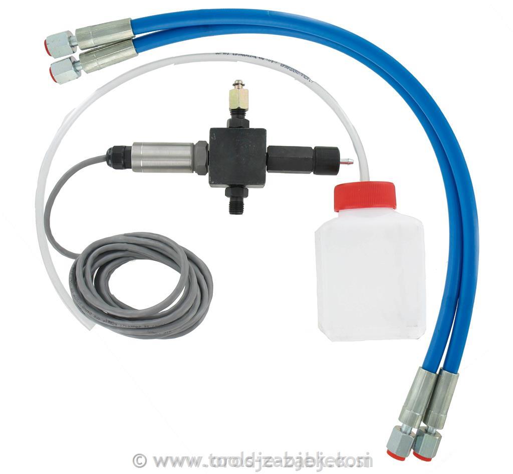 Komplet vključuje senzor 2000 barov, senzorski čep za neposredni tlak črpalke, 2x M12 x 150 cevi za najpogostejše aplikacije in zbiralni rezervoar.
