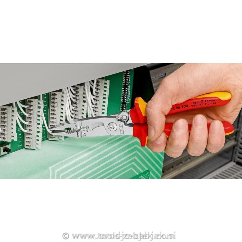- večnamenske klešče za električno napeljavo; za prijemanje ploskih in okroglih materialov, za upogibanje, obrezovanje, rezanje kablov, odstranjevanje in zavijanje koncev rokavov