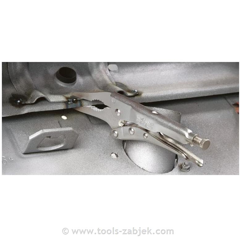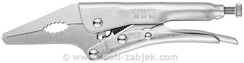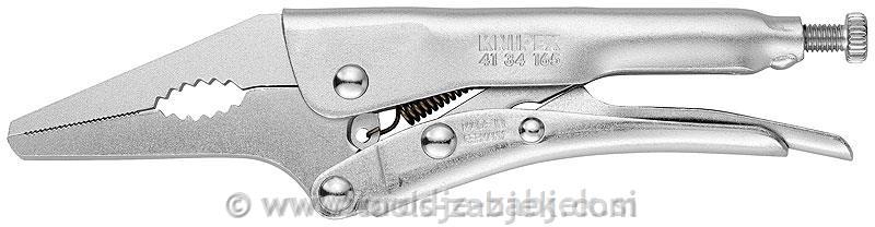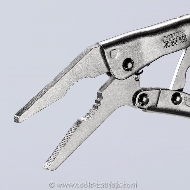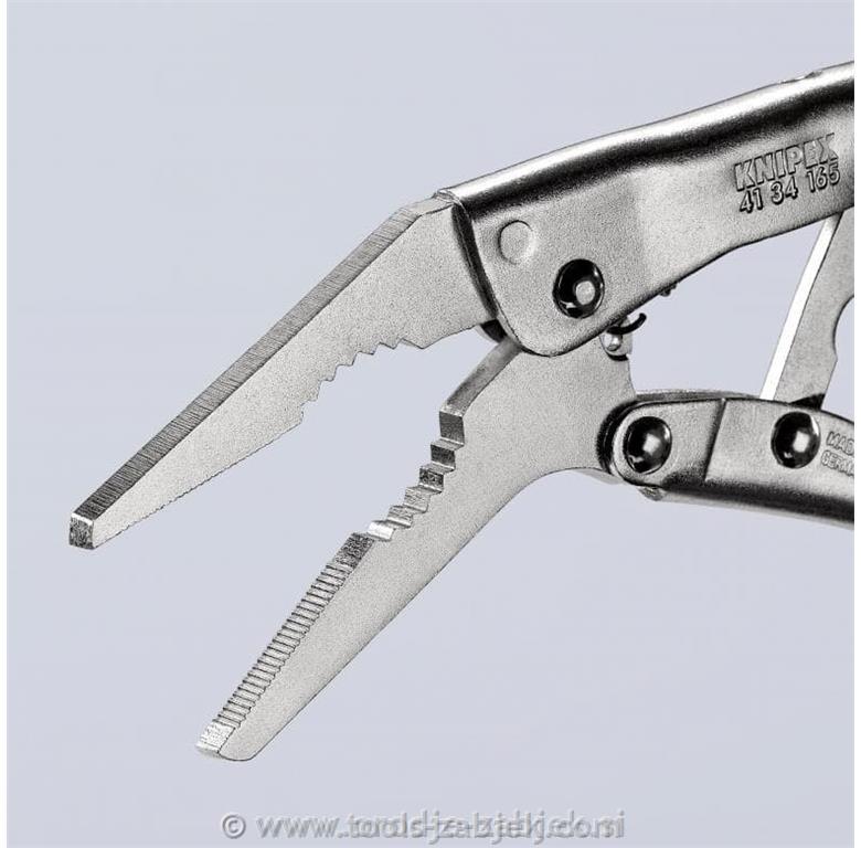 Product description - za prijemanje malih oziroma najmanjših delov (debelina čeljusti na konicah približno 4 mm). - z nastavitvenim vijakom in ročico za sprostitev - enoročno delovanje - visok pritisk tlaka zaradi prestavljanja ročice - prijemalne čeljusti: krom vanadij električno jeklo, kovano