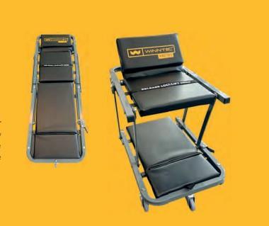 Izjemno dolg, zložljiv delavniški ležalnikl/taburets sedmimi kolesi za enostavno manevriranje.