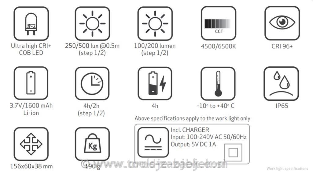 Ročne polnilne delovne luči z odličnim barvnim prikazom. Enostaven za nošenje v žepu ali v delovnem pasu z vgrajeno sponko. Priložen z a dvostopenjska možnost delovanja: 1. korak = 100%, korak 2 = 50% svetlobe. Prilagodljiva glava svetilke se nagne na 180 stopinj. Trpežna konstrukcija, vodoodporen, IP65. Priložen s steklenimi lečami, odpornimi na topila. Indikator baterije spredaj prikazuje, kdaj je treba baterijo napolniti.