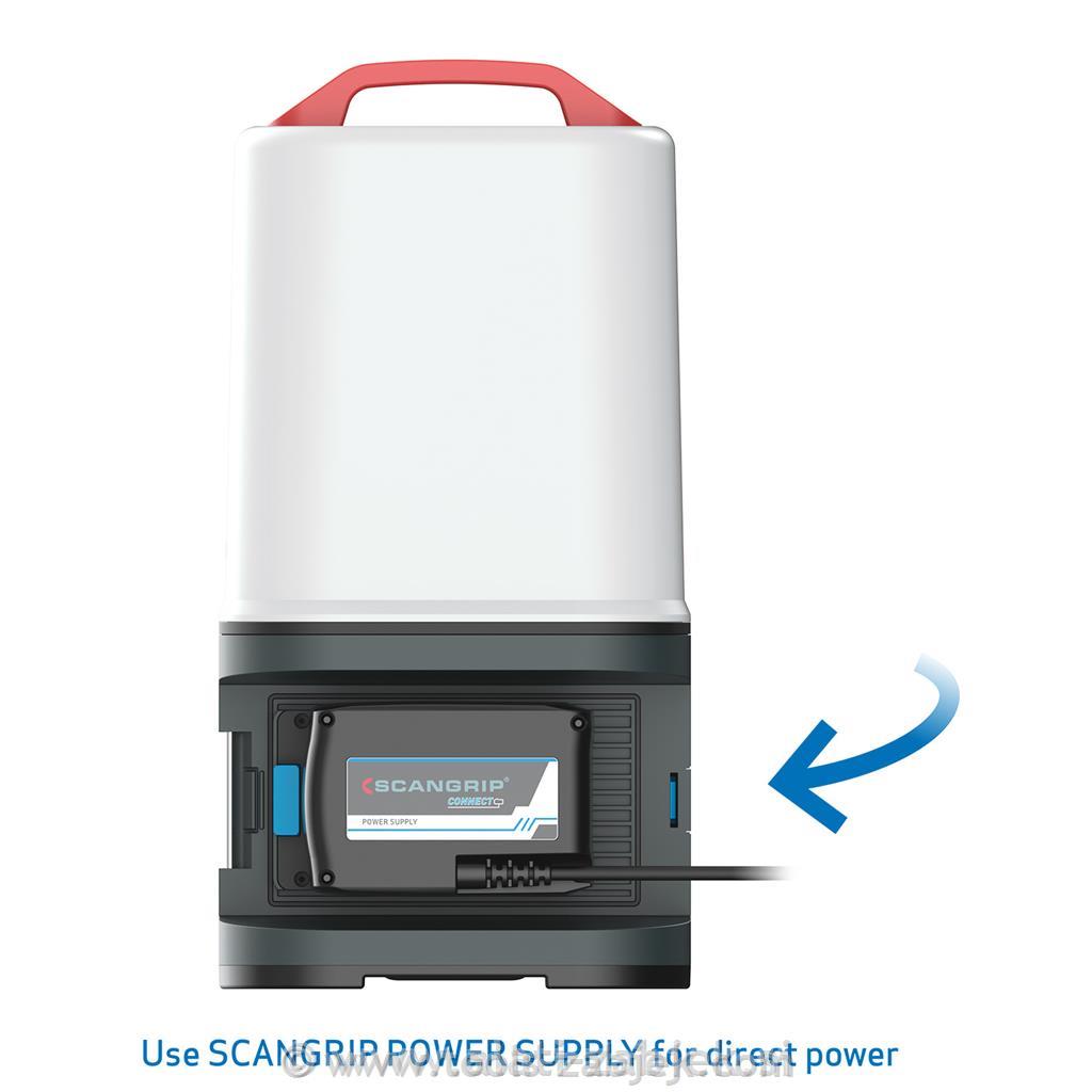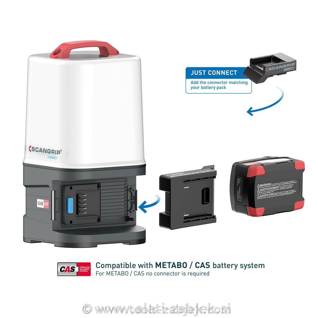 Kot edinstvena funkcija je AREA 10 CONNECT združljiv z baterijskim sistemom METABO / CAS 12 V 4,0 Ah - 18 V 5,2 Ah in vsemi drugimi 18 V baterijskimi sklopi vodilnih znamk električnih orodij z uporabo PRIKLJUČKA SCANGRIP. Poleg tega lahko napajalnik SCANGRIP uporabite za neposredno napajanje, ki zagotavlja neomejeno razpoložljivost svetlobe. AREA 10 CONNECT je baterijska delovna luč z notranjo rezervno baterijo, ki zagotavlja 50 dodatnih minut pri 1000 lumnih.