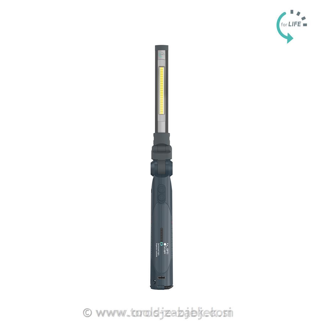 Zahvaljujoč učinkoviti več-LED tehnologiji s 20 LED diodami nudi nastavljivo svetilnost do 500 lumnov. Zgornja svetilka oddaja usmerjen snop s 150 lumni za natančno osvetlitev delovnega območja. Funkcija OPTILight omogoča optimalno osvetlitev in čas delovanja z enim dotikom, kar zagotavlja najboljše razmerje med svetlobo in porabo. Svetilka zagotavlja konstantno svetilnost v skladu z evropskim standardom EN 13032-1.