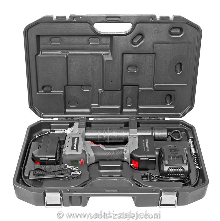 - akumulatorska mazalka je dobavljena v trpežnem prenosnem kovčku s kovinskimi zaponkami in z možnostjo zaklepa kovčka