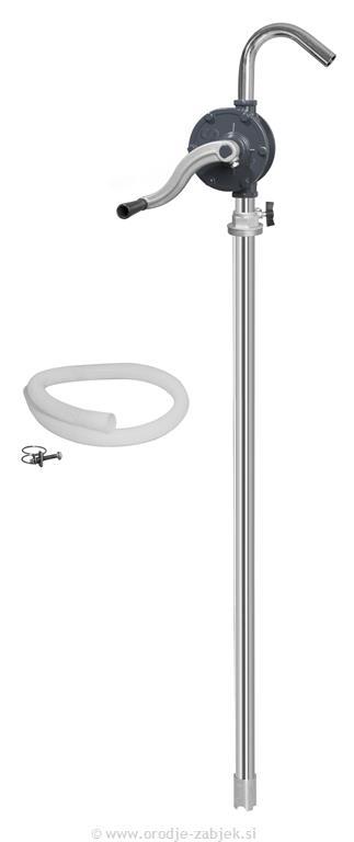Aluminijasta rotacijska črpalka za prenos lahkih do srednje viskoznih naftnih tekočin. Aluminijasto telo črpalke z zamac rotorjem in gredjo. Dobava 0,3 litra na obrat. Črpalka vključuje višinsko prilagodljiv adapter za boben, tri kose sesalne cevi in ??1 m dovodno cev.