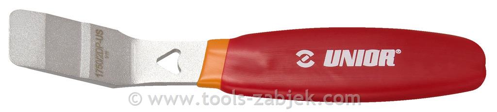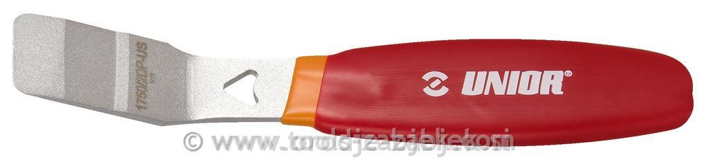 Posebna konična oblika kovinskega dela orodja je izdelana tako, da zdrsne med zavorni ploščici v zavorni čeljusti, kar nam omogoča, da enostavno potisnemo zavorne batke nazaj v čeljust. Orodje ima dvokomponentni ročaj za udobje in je ukrivljeno pod kotom 30° za lažje rokovanje.
