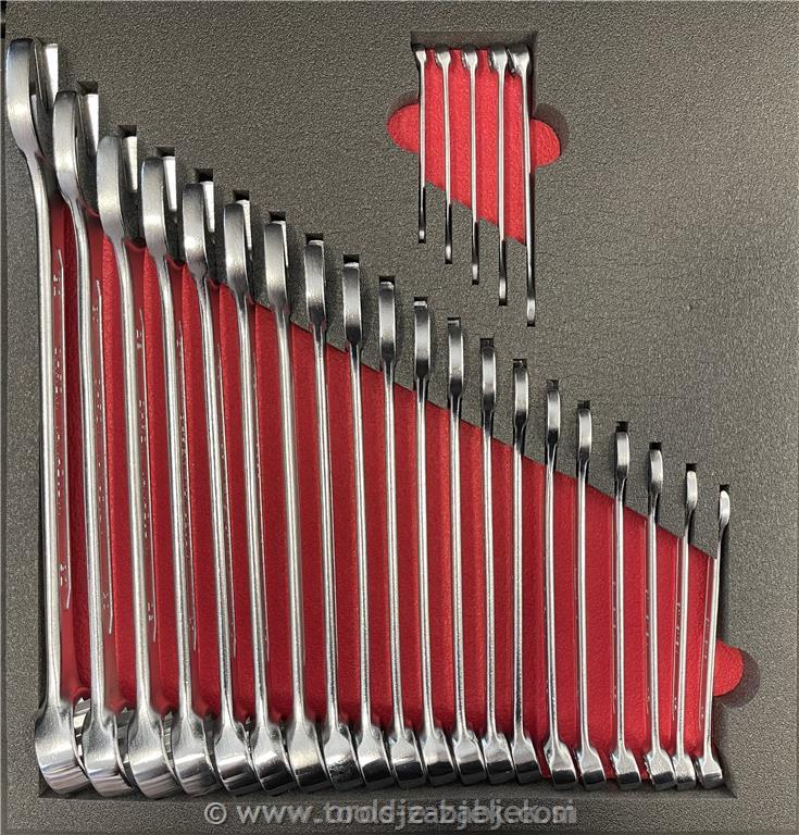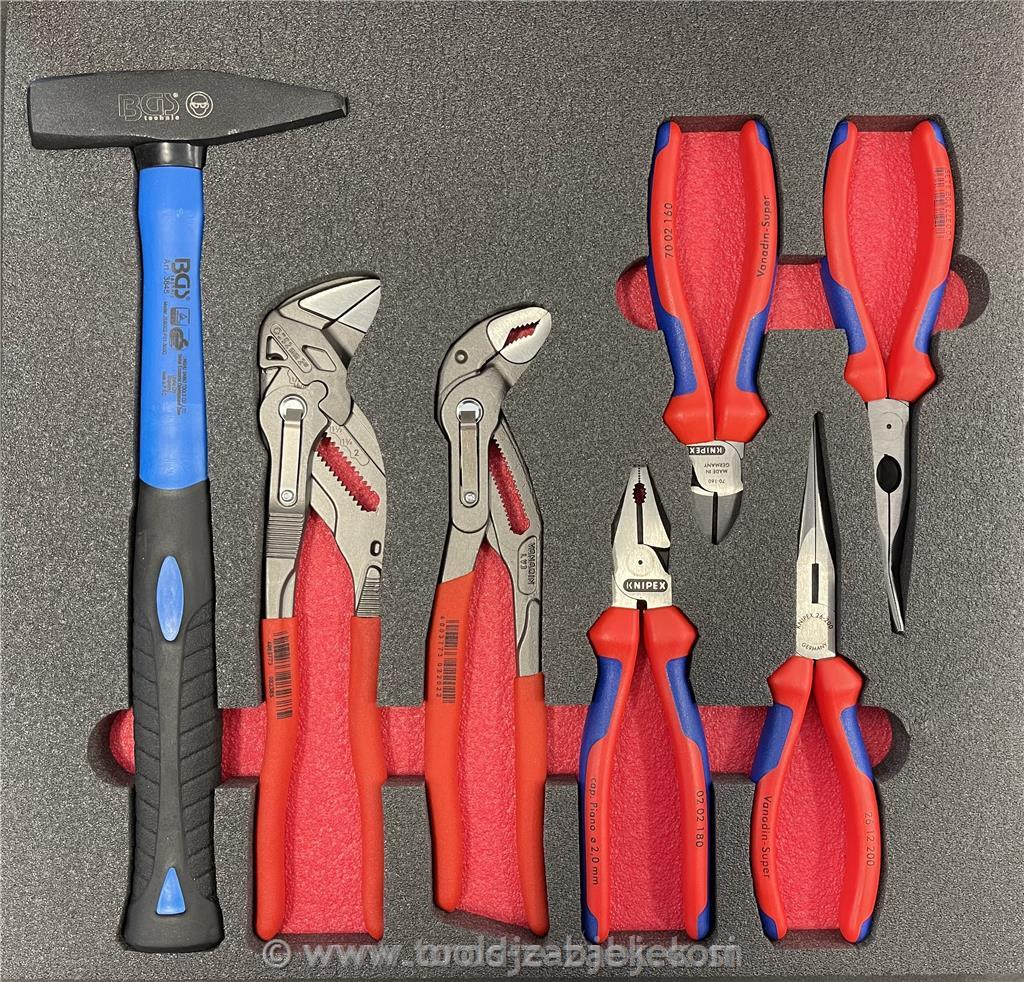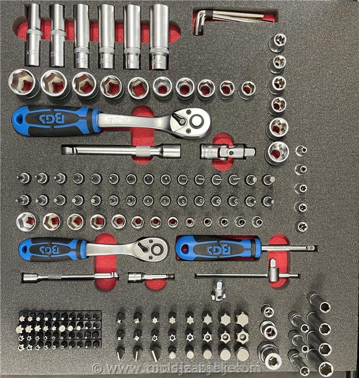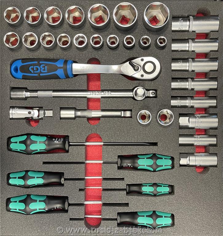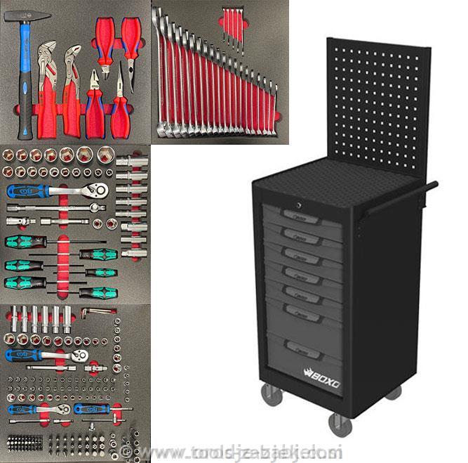 Voziček z sedmimi predali. Vključuje štiri polne predale z naslednjimi orodji: