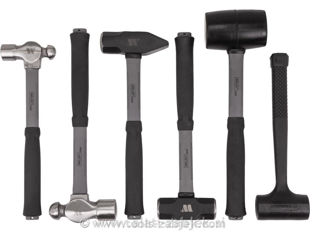 - komplet kladiv vrhunske kakovosti, ki vključuje najbolj priljubljene velikosti: standardna kladiva so opremljena z vzdržljivimi ročaji iz steklenih vlaken, udarno kladivo pa je obdano z dolgotrajno prožno kompozitno kožo
