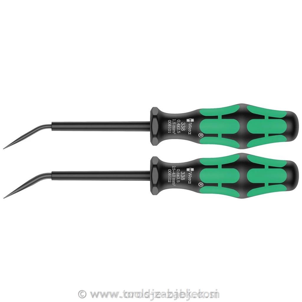 Komplet 2 delovnih orodij za vzmetne spone. Ukrivljeni noži prav tako olajšajo aktiviranje vzmetnih sponk v razdelilnih omaricah, ki jih ni mogoče doseči z ravnim rezilom. Rezilo ostane v objemki, obe roki pa pustita prosti za vstavljanje kabla. Večkomponentni ročaj Kraftform za hitro in nežno delo.