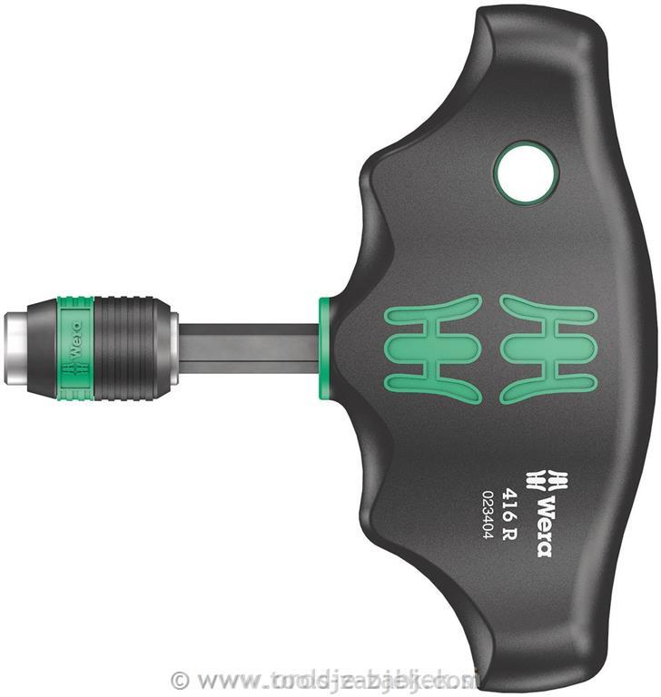 Opis: - izvijač s T-ročajem: Idealna oblika ročaja, ki omogoča visok prenos navora v težkih situacijah zategovanja in popuščanja - ergonomska oblika ročaja dobro napolni dlan, prsti varno ležijo v mehkih zaobljenih vdolbinah ročaja - celotna roka vzpostavi stik z ročajem in prepreči izgube zaradi trenja med roko in ročajem - držalo za šestkotne bite s pogonom 1/4 "po DIN ISO 1173-C 6.3 in E 6.3 - s tehnologijo Rapidaptor za hitrostne spremembe bitov