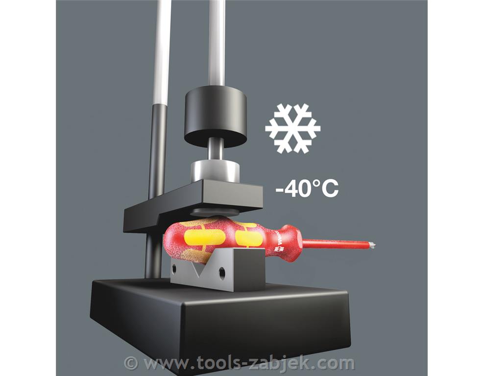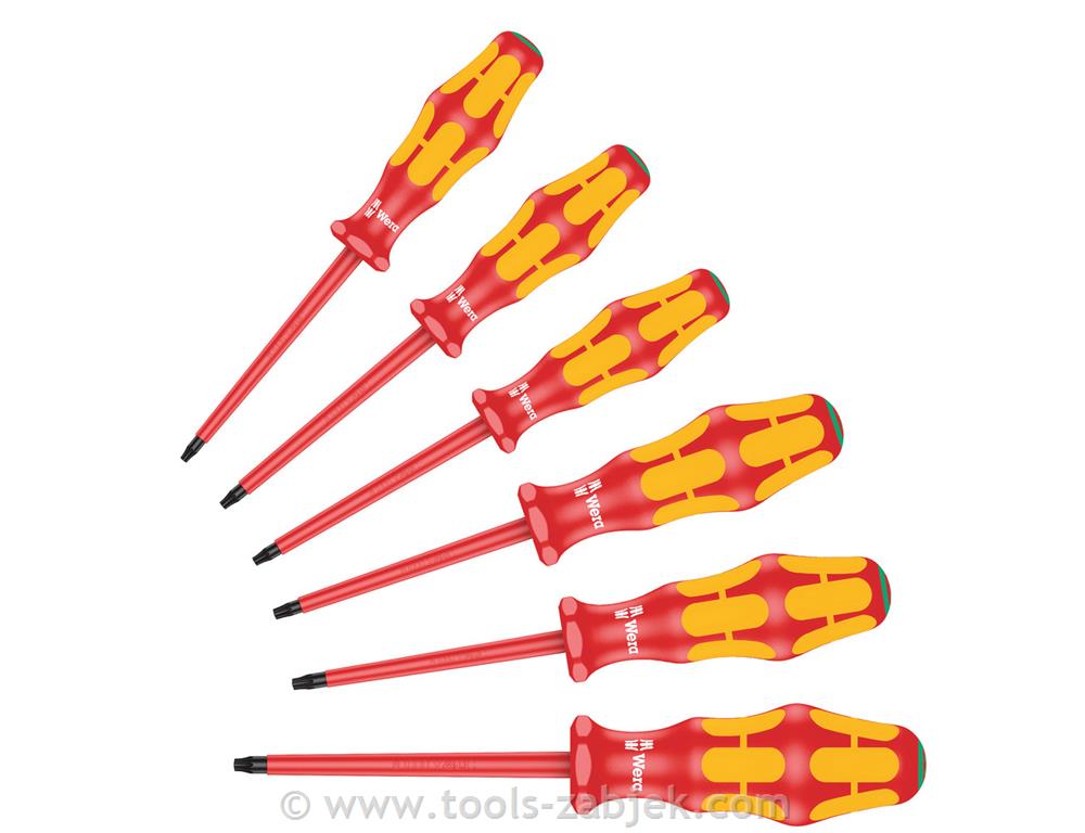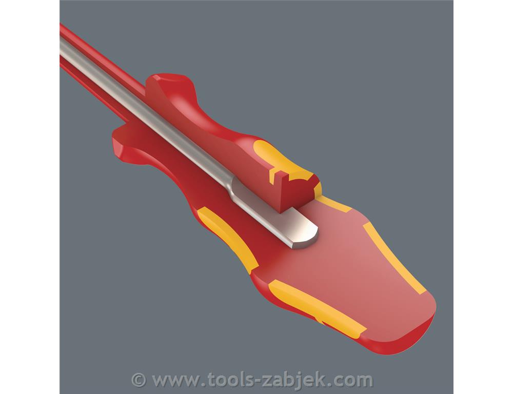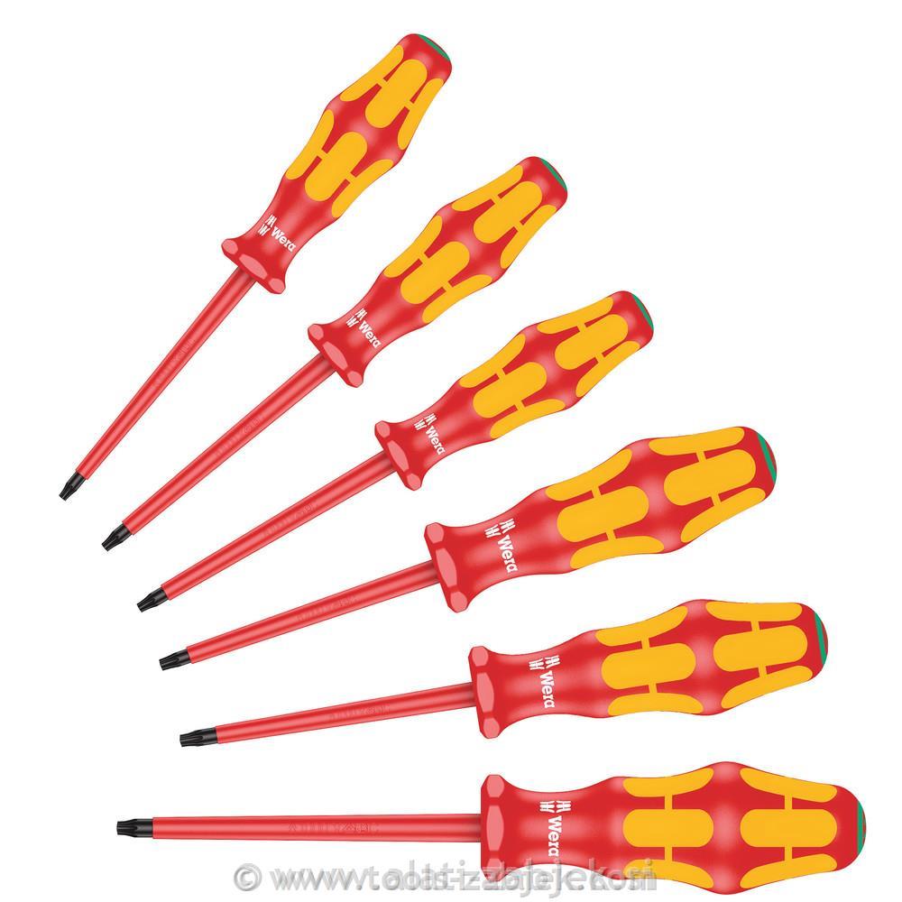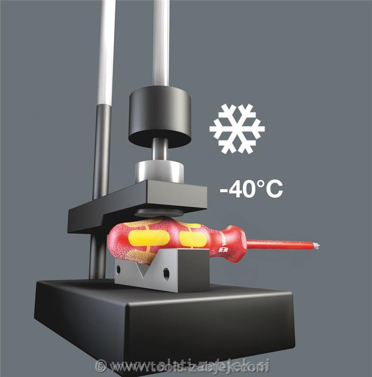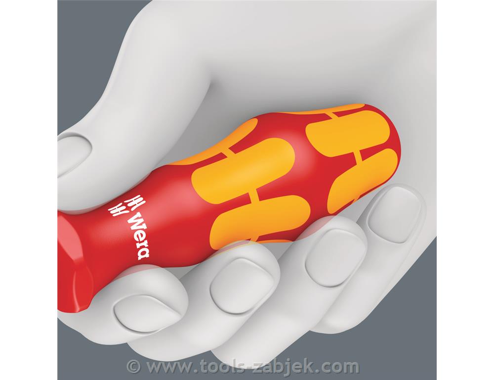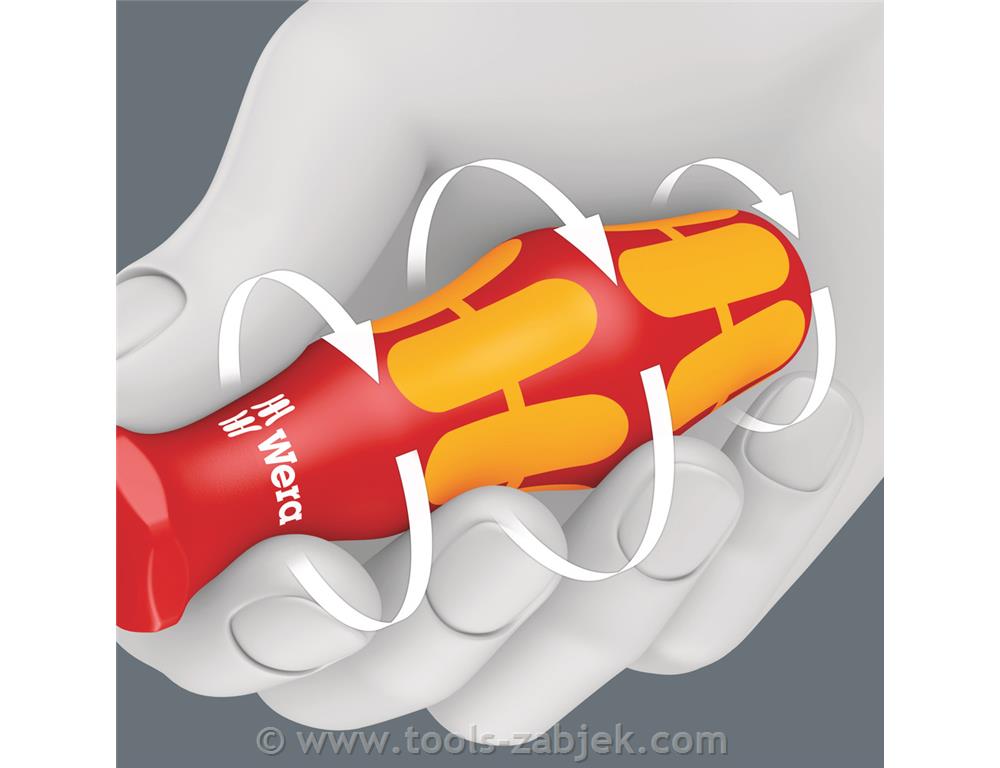 - 6-delni komplet izvijačev Wera VDE z večkomponentnim ročajem Kraftform Plus: trde cone prijema za visoke delovne hitrosti, medtem ko mehke cone zagotavljajo visok prenos navora